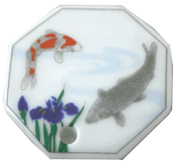 池のほとりに咲く花菖蒲と涼しげに泳ぐ鯉をあしらいました